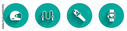 Set Racing helmet, Jump rope, Torch flame and Smart watch with heart icon with long shadow. Vector