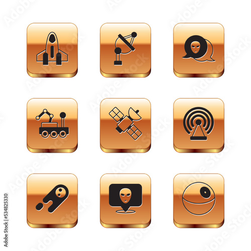 Set Rocket ship, Comet falling down fast, Alien, Satellite, Mars rover, Planet and dish icon. Vector