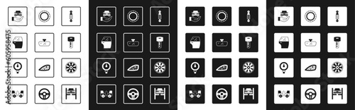 Set Shock absorber, Car mirror, door, Auto service check automotive, key with remote, tire wheel, Alloy for car and Tire pressure gauge icon. Vector