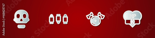 Set Skull, Bullet, Medieval shield with axe and Video game bar icon. Vector