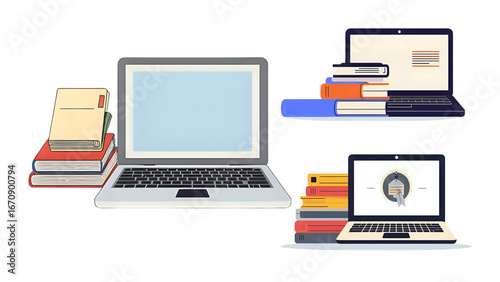 set stack of books and laptop
