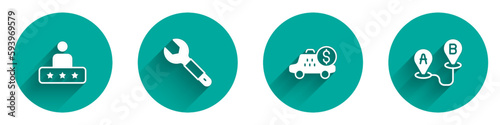Set Taxi service rating, Wrench spanner, Taximeter device and Route location icon with long shadow. Vector
