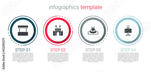 Set Ticket box office, Castle, Fountain and Magic ball on table. Business infographic template. Vector