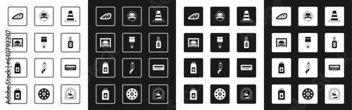 Set Traffic cone, Engine piston, Car wash, headlight, key with remote, service, audio and Canister for motor machine oil icon. Vector