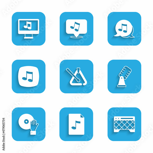 Set Triangle musical instrument, MP3 file document, Guitar amplifier, Microphone, DJ playing, Music note, tone, and Computer with icon. Vector