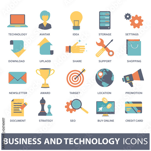 Set vector icons with elements for mobile concepts and web apps. Business and marketing, programming, data management, internet connection, social network, computing, information. Vector