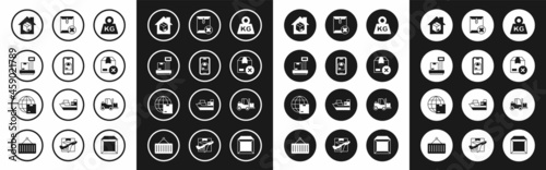 Set Weight, Mobile app delivery tracking, Scale with cardboard box, Home services, Carton, Delete envelope, Forklift truck and Worldwide shipping icon. Vector
