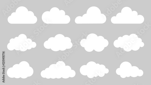 Set white cloud icons on a gray background. Cloud shapes vary in size and form. Perfect for weather, sky, or nature themes. Cloud icons for design use. Weather illustration, vector set.