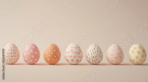 Seven Pastel Easter Eggs with Abstract Patterns on a Light Pink Background