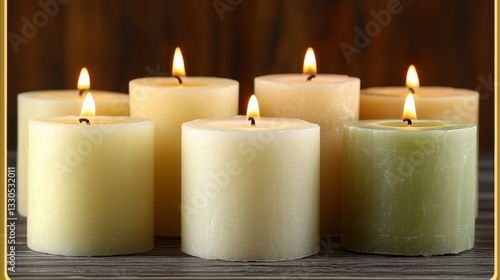 Several candles in various shades of cream and green illuminate a wooden surface, casting a soft glow in a cozy room. The warm light enhances the serene atmosphere