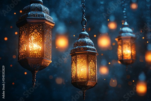 Several decorative lanterns hanging and illuminating a dark background beautifully