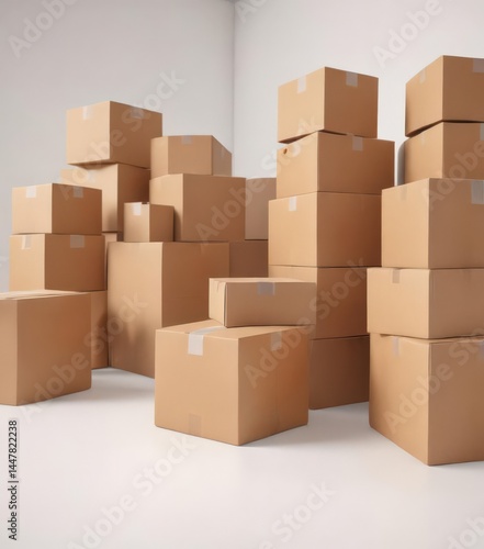 Several empty brown cardboard boxes against a bright white backdrop , design, cleanliness