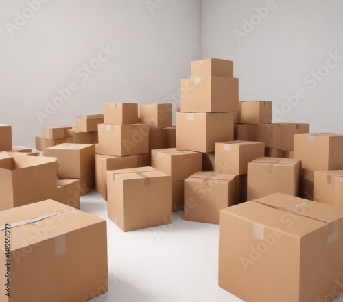 Several empty brown cardboard boxes arranged on a stark white surface , purity, earth, reuse