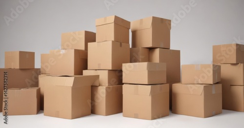 Several empty brown cardboard boxes, white background , stack, disposal, brown