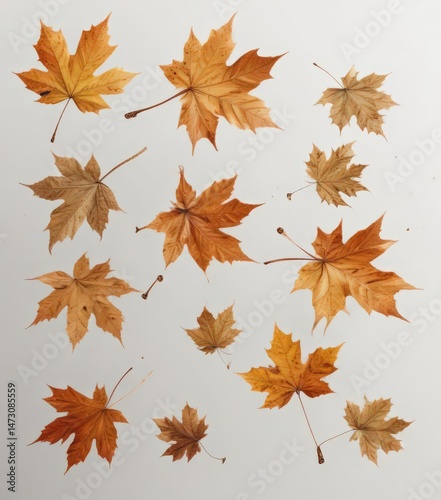 Several falling maple leaves in various stages of decay, isolated on white , macro, isolated leaves, forest