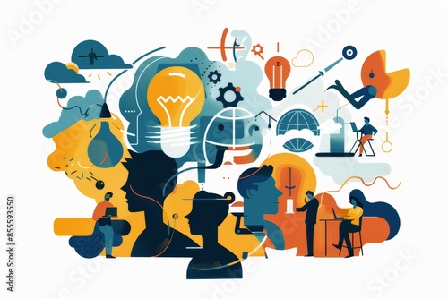 Several individuals gathered around a brightly lit light bulb, discussing and brainstorming ideas, A series of illustrations depicting various aspects of entrepreneurship and innovation