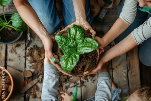 Several people are working together to pot a healthy green plant supported by a wooden table and surrounded by gardening supplies, emphasizing teamwork and growth.