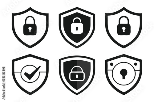 Several shield shapes containing lock, check mark and keyhole symbols conveys security concept with transparency