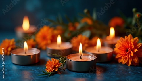Several tea light candles burn brightly. Orange marigolds surround on dark teal surface. Gentle warm light emanates from candles. Scene evokes contemplative spiritual mood ideal for Day of Dead.