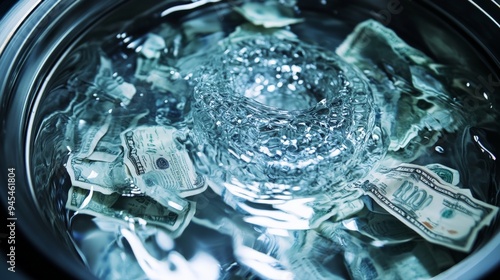Several U.S. dollar bills float within the watery environment of an active washing machine, offering a visual metaphor representing the concept of money laundering.