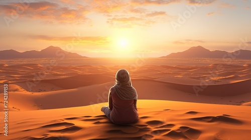 Sexy woman walking in the desert.Beautiful view on the mountain at sunset. Amazing sand dunes. Golden sand waves. Natural safari panorama. Unique journey.