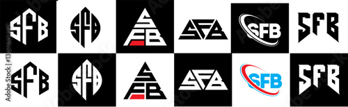SFB letter logo design in six style. SFB polygon, circle, triangle, hexagon, flat and simple style with black and white color variation letter logo set in one artboard. SFB minimalist and classic logo