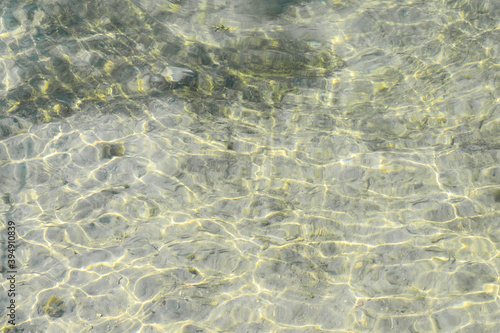 Shallow clear green and yellow water with algae and small stones on the bottom. Shiny light reflections pattern and waves