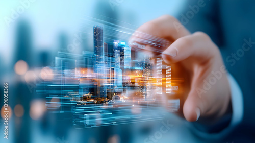 Shaping the future: A hand interacts with a vibrant, digital cityscape, a vision of technological advancement and urban innovation with a futuristic, blue and orange color palette.