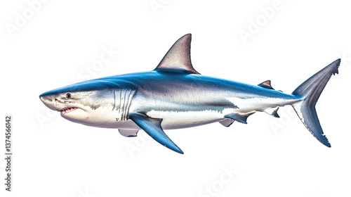 Shark with sharp teeth, fins and tail, isolated black background, cut out transparent