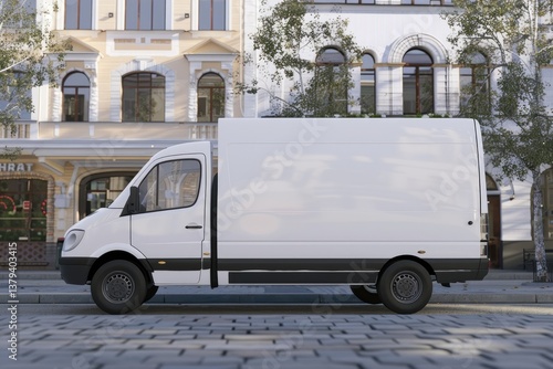Sharp Image of White Delivery Truck Rendering Van Side View in Street