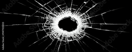 Shattered Glass, Abstract Black and White Background with Radial Cracks and Hole