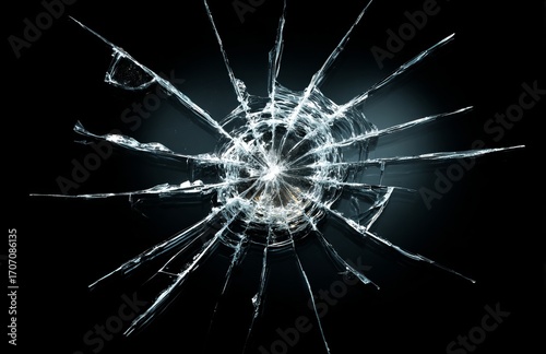 Shattered glass on a dark surface exhibits a cracked pattern that bears a striking resemblance to the web of a spider