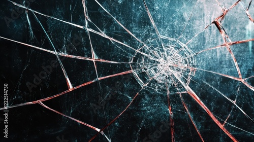 Shattered Glass Texture with Red and Teal Highlights, Abstract Broken Surface.