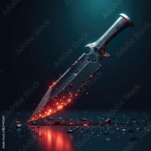 Shattered steel blade suspended in a dark environment, steel, broken, sharp