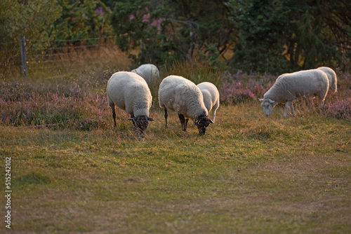 Sheep grazing in a heather meadow during sunset in Rebild National Park, Denmark. A flock of woolly lambs walking and eating grass on a blooming field or a pastoral land on a farm. Free range mutton
