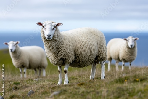 Sheep grazing peacefully on a hillside with a distant view of the sea