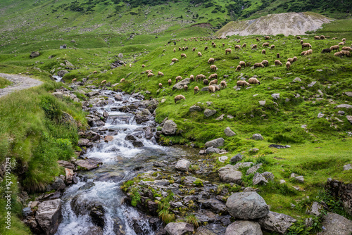 Sheeps on a pasture next to Transfagarasan Road in southern section of Carpathian Mountains in Romania