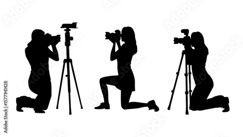 Sheet of Silhouette Photographers in Action – Kneeling, Adjusting Camera, Tripod Setup PNG Transparent Background
