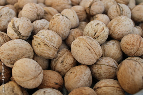 shelled walnuts. Pile of unshelled walnuts in daylight. walnut background.
