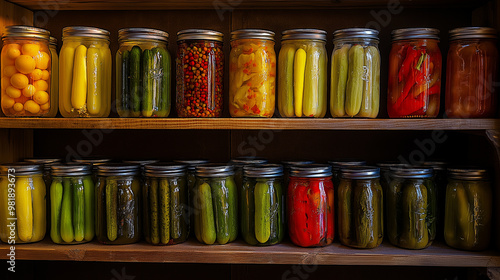 Shelves filled with colorful jars of pickled vegetables and fruits.