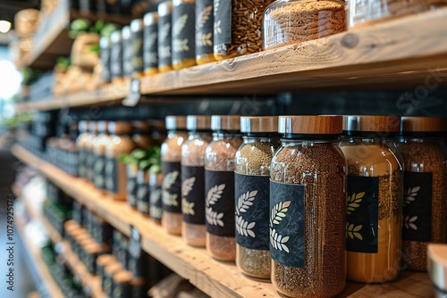 Shelves filled with jars containing various grains, spices, and condiments create a colorful and organized pantry. Natural light highlights the textures and labels, enhancing the inviting atmosphere