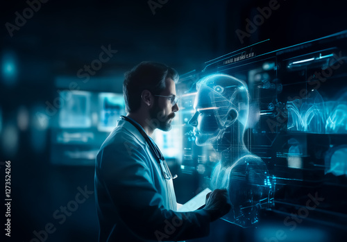 Shenzhen, China - Unknown Date : A bearded doctor in glasses interacts with a holographic medical interface, displaying a human body scan in a futuristic, high-tech environment for diagnosis.