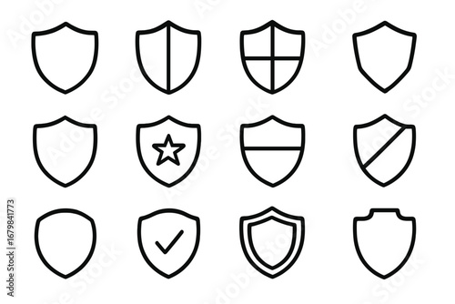 Shield icon set. Security symbol collection. Protection, safety, guarantee concepts. Vector line art badges. Guard, defense emblem. Secure data privacy pictogram for web.