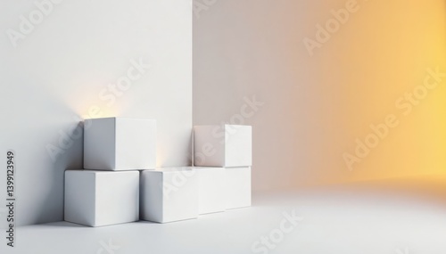 Shifting blocks of white cubes on a contrasting background, generating visual interest, modern design, white cube boxes