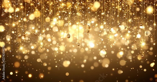 Shimmering golden bokeh background with sparkling lights and falling ornaments for festive celebrations, elegant occasions, and glamorous events