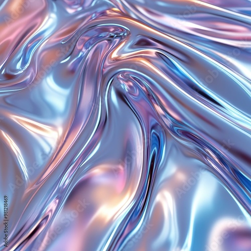 Shimmering metallic fabric with fluid waves, showcasing iridescent colors and smooth textures, perfect for artistic backgrounds.