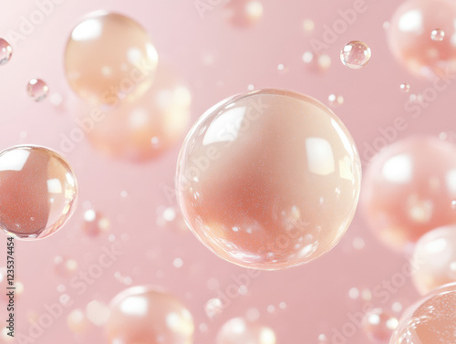 Shimmering Pearl Bubbles: A captivating abstract image featuring a cluster of pearlescent bubbles suspended in mid-air against a soft pink background. The bubbles shimmer and reflect light.