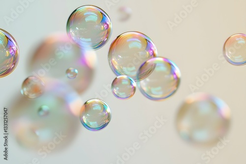 Shimmering soap spheres drift effortlessly on a fresh, subtle backdrop, gleaming with a rainbow of