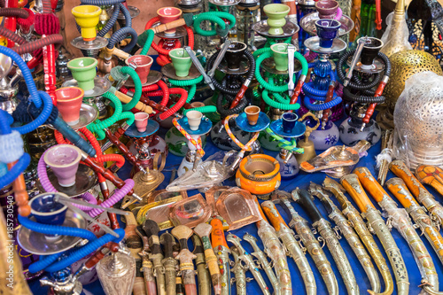 Shining moroccan metal lamps and souvenirs in the shop in medina of Marrakech, Morocco