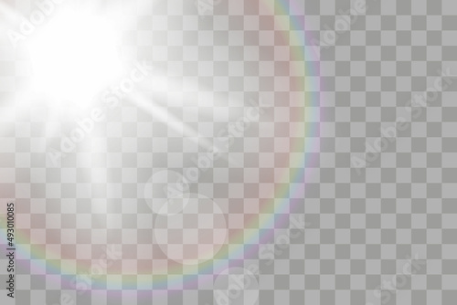 Shining sun glare rays, lens flare vector illustration with a rainbow. Sunlight glowing png effect. White beam sunrays sky background